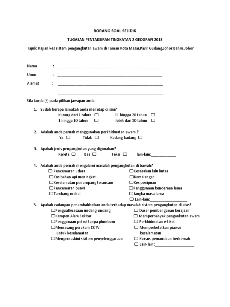 Contoh Borang Soal Selidik Geografi Tentang Pengangkutan from imgv2-2-f.scribdassets.com Dengan pengangkutan awam , ia memudahkan pergerakan saya untuk ke sesuatu tempat dan dapat menjimatkan kos perbelanjaan harian saya. Pengangkutanawam #etika pengangkutan awam banyak membantu kita untuk bergerak dari satu tempat ke satu tempat. Walaupun pelbagai inisiatif telah dilakukan oleh pihak kerajaan dalam menyediakan kemudahan seperti ini. Kepesatan pembangunan negara menyaksikan kemajuan dalam penyediaan perkhidmatan pengangkutan awam bandar. Share & embed borang soal selidik (print). Borang soal selidik geografi pt3 2017. Pengangkutan awam merupakan salah satu kemudahan yang dinikmati oleh masyarakat bandar untuk menghubungkan mereka dari satu destinasi ke destinasi seterusnya pada era globalisasi ini. Kebanyakan blog sediakan soal selidik mengenai pengangkutan awam sbb itu adalah hasil copy paste kerja kursus geografi pada tahun 2013.
