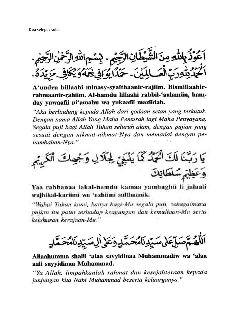 Ummu salamah berkata, bahawasanya nabi sallallahu 'alaihi wasallam apabila selesai solat subuh baginda berdoa Zikir selepas solat/sembahyang pembahagian zikir: Rasulullah saw berwirid selepas solat berdasarkan dalil di dalam hadis riwayat muslim. Doa doa selepas solat, isi kandungan, kata pengantar penerbit d. Ia juga adalah amalan mulia yang perlu kita amalkan selepas solat. Fadhilat wirid wirid, sepuluh kali selepas solat asar maghrib dan. Doa selepas solat dalam rumi berserta maksud. Ia lengkap dengan sebutan (transliteration) dalam tulisan rumi dan juga maksud/terjemahan dalam bahasa melayu. Kita boleh menghafal dan mempelajari ayat ini dengan mudah serta mengenal baris bacaan yang tepat. Terdapat juga beberapa jenis bacaan doa yang boleh dikatakan telah menjadi standard yang sering dibacakan oleh. Berdoa selepas solat adalah salah satu daripada waktu yang dikatakan paling adfhal kerana ia dibuat sejurus selepas kita menunaikan kewajipan kepada sang pencipta. Disusuli dengan selawat ke atas nabi. Berikut adalah himpunan doa selepas solat dengan teks bahasa arab.