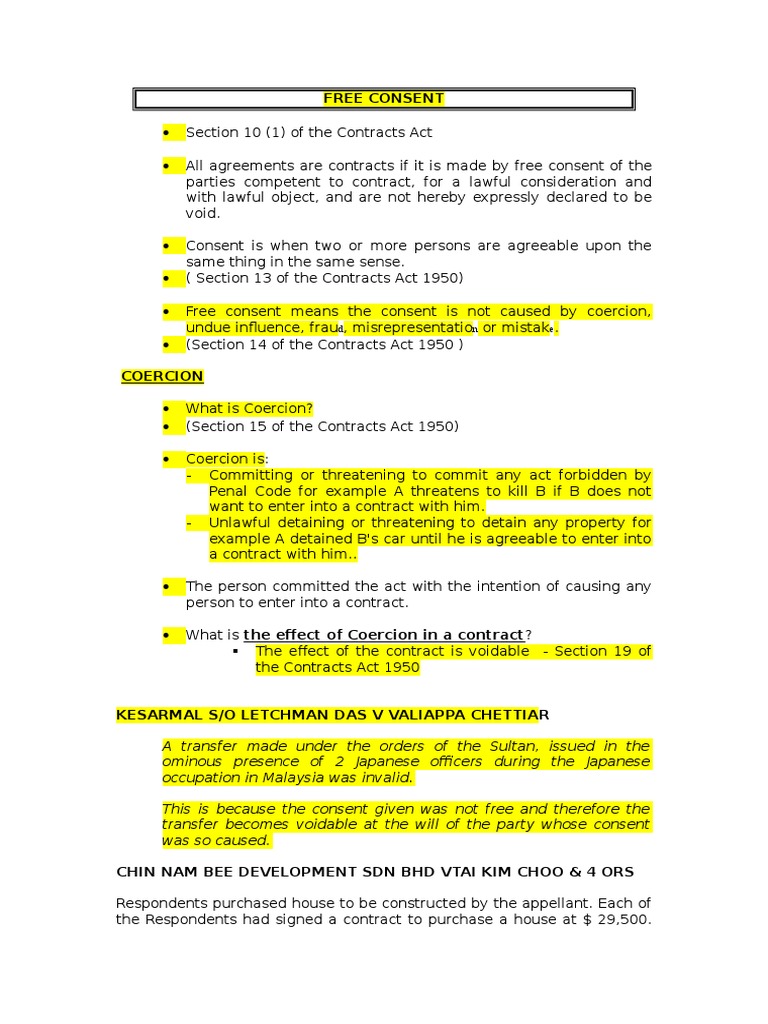 Contracts according to contract act 1950 2.1.2 explain the essentials of valid and enforceable contract: This is to avoid any performance of the contract to be ambiguous interpretation by the court. One of the essentials of a valid contract mentioned in section 10 is that the parties should enter into the contract with their 'free consent'. This video explains about one of the elements in the law of contract which is free consent, specifically 'coercion' and 'mistake'. The term free consent mentions to meeting of free and fresh minds of two parties or more of an agreement when two parties take and understand, purpose, subject matter and terms and conditions of the agreement in the same sense it.