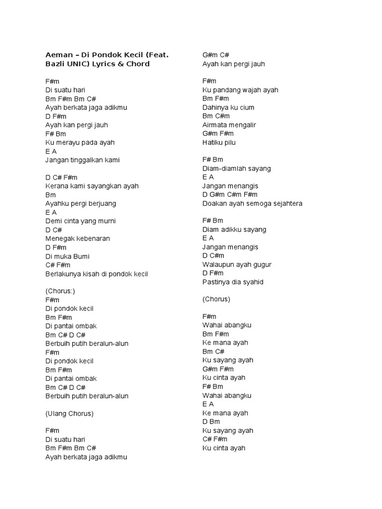 Seperti lagu di pondok kecil, munajat, tuhan memanggil… sehinggalah kepada era millennium dengan lagu pergi tak kembali, anak soleh, dan pelbagai lagi lagu dan zikir yang arwah alunkan… Di pondok kecil di pantai ombak. Bazli, tidak terasa air mata saya meleleh di pipi. Di pondok kecilae man feat bazli unic lirik :di suatu hariayah berkata jaga adikmuayah kan pergi jauhku merayu pada ayahjangan tinggalkan kamikerana kami say. Di pondok kecil di pantai ombak.